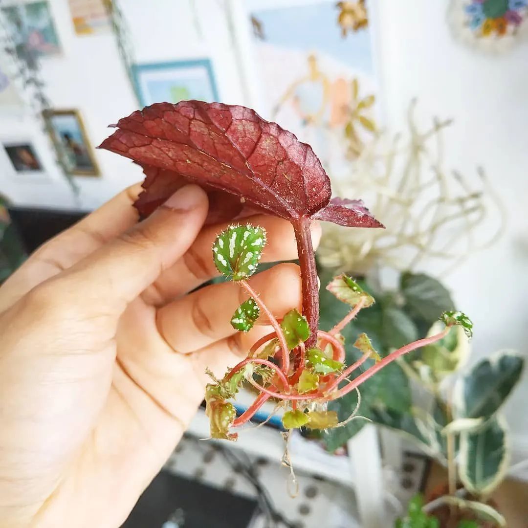 想要繁殖铁十字秋海棠就极其简单了,可以用叶片扦插繁殖,健壮饱满的叶子剪下来,去掉一半的叶柄之后,斜插在土壤中,用纯蛭石或泥炭土搭配珍珠岩,以1:1的比例混合,保持土壤湿润,维持80%~90%左右的空气湿度,温度在20度左右,之后就保持土壤湿润,它的叶片就可以慢慢生根发芽。