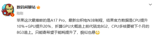该博主表示,苹果此次发布会最“难蚌(绷)”的就是A17 Pro这颗仿生芯片了。A17 Pro使用了台积电最为先进的N3B制程,结果苹果官方放出来的数据是CPU性能提升10%以及GPU性能提升20%。经过折算,苹果iPhone 15 Pro的A17 Pro在GPU方面大概可以追上高通的骁龙8 Gen 2移动平台,但是CPU多核方面会被即将于下个月发布的高通骁龙8 Gen 3移动平台赶超,只能寄希望于能效的提升。但是该博主直言:“这貌似也悬。”