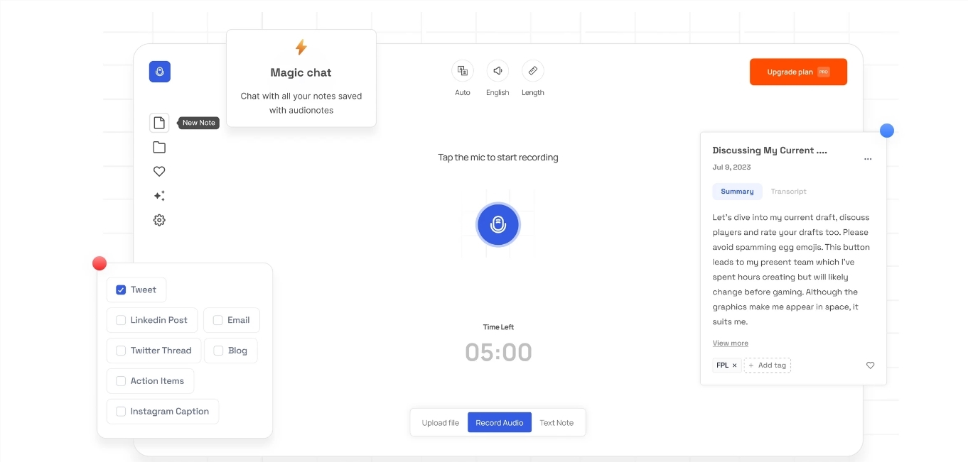 通过录音、上传音频或者直接输入文本,音频笔记都可以利用AI技术为您生成文本摘要。无论您是录制语音笔记,上传音频文件,还是直接创建文本笔记,音频笔记都可以按照您设置的语言、文体和长度要求,自动生成结构化的文本摘要。
