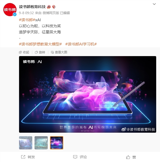 站长之家9月13日 消息:国内知名教育科技智能硬件品牌读书郎在其官方微博上发布了三张图片,并配以话题标签“读书郎梦想教育大模型”和“ AI 学习机”,此举可被视为读书郎公司即将开始研发自己的大模型的公开声明。
