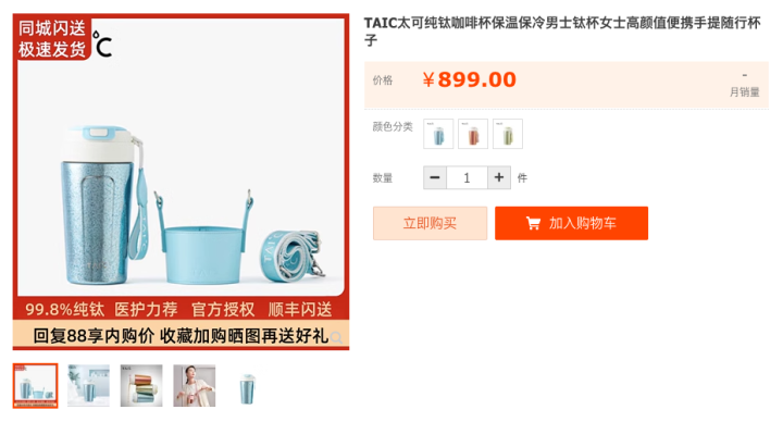 这也使得钛金属相关制品的价格异常高昂。在淘宝搜索钛金属杯子,可以发现一款名为“TAIC太可纯钛咖啡杯”的产品售价高达899元,远高于传统杯子。