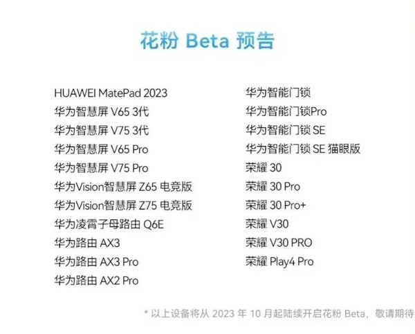 除了华为MatePad 2023平板,这次支持更新的产品都是智慧屏和路由器,其中包括华为智慧屏V65 3代、华为智慧屏V75 3代、华为智慧屏V65 Pro、华为智慧屏V75 Pro、华为Vision智慧屏 Z65电竞版、华为Vision智慧屏Z75电竞版、华为凌霄子母路由Q6E、华为路由AX3、华为路由AX3 Pro、华为路由AX2 Pro、华为智能门锁、华为智能门锁Pro、华为智能门锁SE以及华为智能门锁SE猫眼版。这些产品下个月起将陆续开启花粉Beta。
