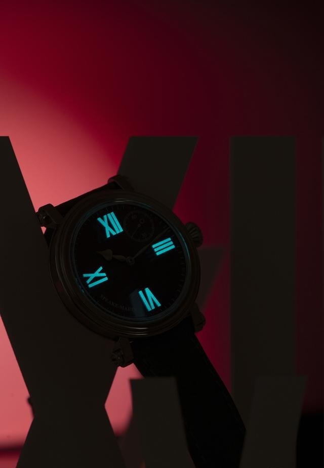 在12、2、6和9点的立体罗马数字时标上,以Billight红色雾面超级荧光涂料涂布,与红色漆面表盘相映成趣。在7点和8点之间的弧形SPEAKE MARIN logo对角,位于1:30位置的小秒针盘以白色呈现,中央的心形与黑桃铑镀时、分指针则与深红色表盘形成鲜明对比。
