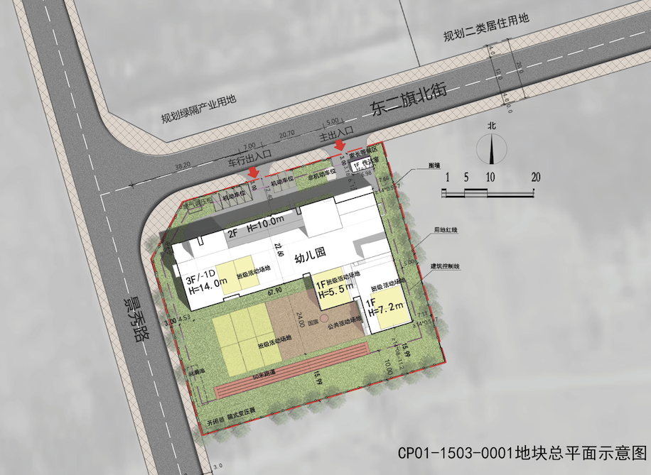幼儿园规划3层12班,用地规模0.67万平,包括了班级活动场地、公共活动场地、50米跑道、家长等候区以及机动车位等。