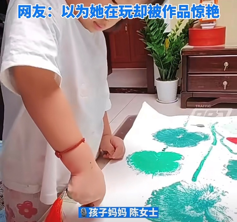 山东的一个小女孩,晚上临睡前画兴大发,用手、塑料袋、泡泡……绘出一幅栩栩如生的鱼戏莲叶图。