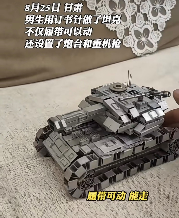 甘肃的一个男孩,用订书针做出了一辆坦克,不仅履带能自如前进后退,坦克身上还一比一复制了炮台和重机枪;