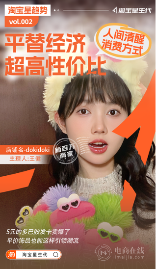同时,淘宝星生代还洞察到各类经济趋势增长,,为特色品类中小商家进行店铺精准曝光,在近期上线了“平替经济”活动会场,各种类目的高性价比商品应有尽有,满足用户不同的需求。用户打开淘宝,进入淘宝星生代“平替经济”活动页面,就有“DokiDoki”的身影。