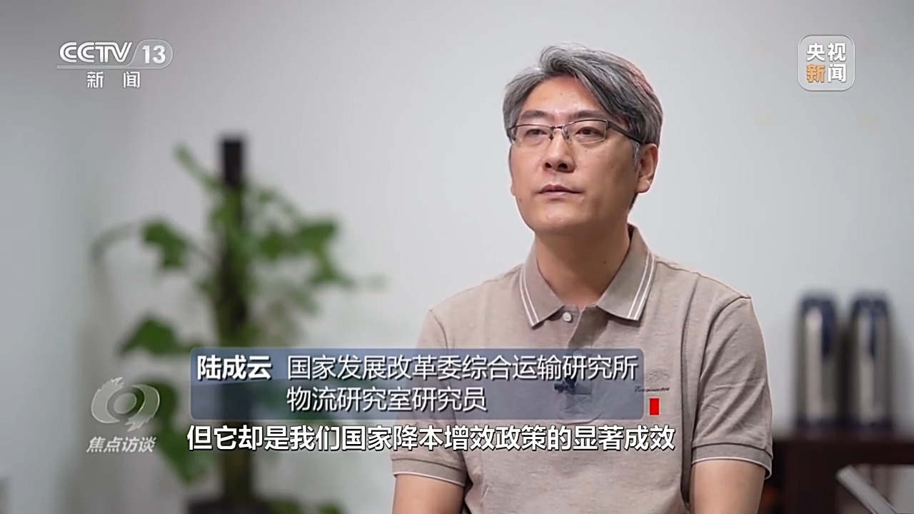 国家发展改革委综合运输研究所物流研究室研究员 陆成云:不要小看这3.3个百分点,数字不大,但它却是我们国家降本增效政策的显著成效,同时也是整个行业付出巨大努力的一个结果,并且背后的经济价值和意义巨大。按照我们国家的经济体量来算,这3.3个百分点相当于接近4万亿的经济价值。