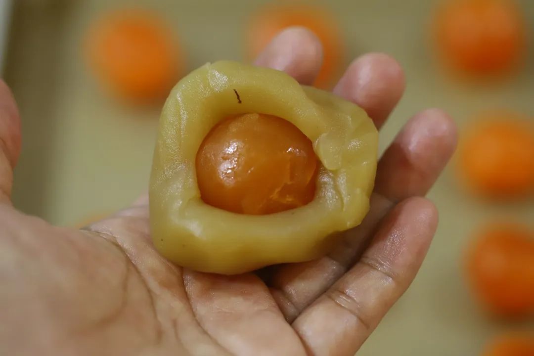 将饼皮擀圆,包上月饼馅,
