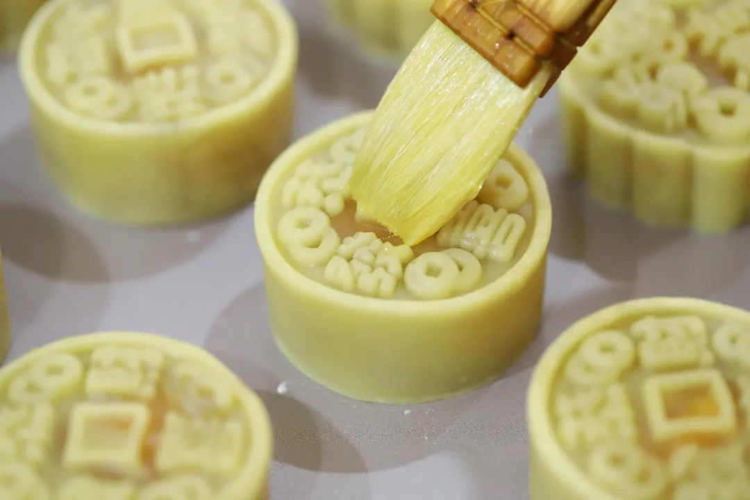 取出月饼,薄薄刷上蛋液。