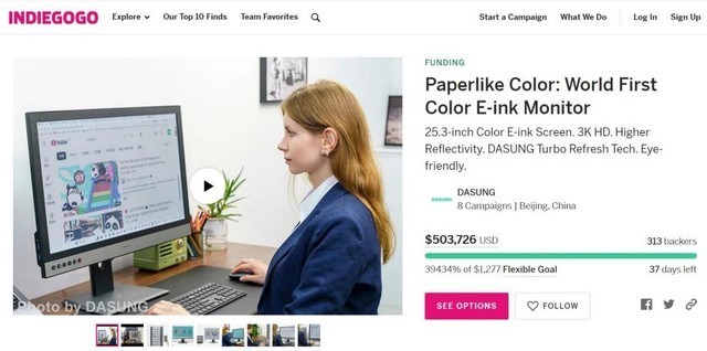 近日,专注研制电子墨水显示器(一种类纸显示器)开发的北京DASUNG大上科技,在美国Indiegogo官方网站突然发布了一款25.3英寸彩色墨水屏显示器——Paperlike Color。据悉,该产品是全球第一款彩色墨水屏显示器,上线不到一周即众筹了50多万美元,成为热点项目,受到了很多海内外消费者的热烈期待和支持。这款创新于中国的产品,也成为今年电子墨水类产品里备受关注的爆款。