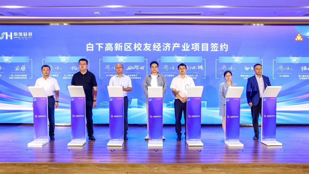 秦淮区政协主席何素玉、白下高新区管委会主任蔡嘉,南大、东大校友会及南航、南理工、哈工大、西交大、中南大学南京校友会代表共同为“秦淮硅巷校友经济创新服务中心”揭牌。校友经济创新服务中心将深化校友经济协同发展,促进校地融合聚力创新,形成携手奋进、互惠共赢的良性循环。