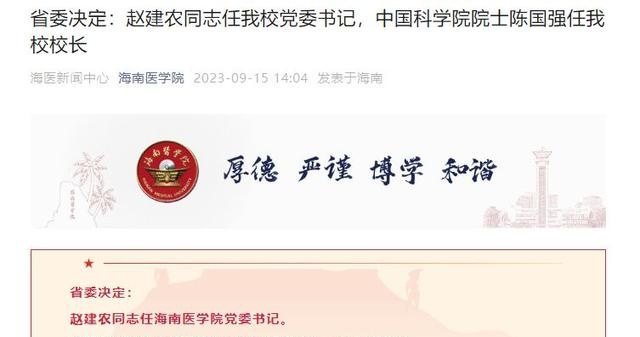 据海南医学院消息,赵建农同志任海南医学院党委书记。
