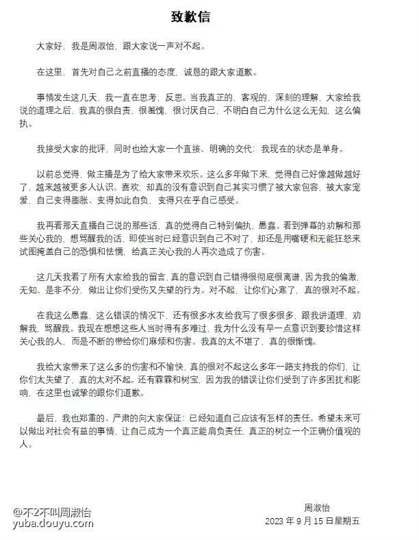鞭牛士 9月15日消息,网红主播周淑怡今日在直播中道歉并发布致歉信,诚恳道歉并称目前是单身。