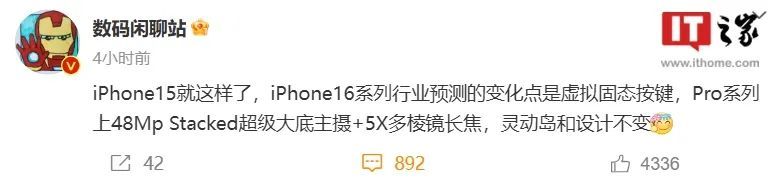 据博主 @数码闲聊站今日爆料,iPhone 16 系列行业预测的变化点是虚拟固态按键,Pro系列升级搭载 48Mp Stacked 超级大底主摄 + 5X 多棱镜长焦,灵动岛和外观设计保持不变。他还表示标准版机型将加上高刷新率,但没有透露是 90Hz 还是 120Hz。