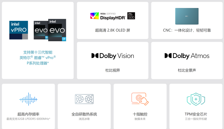 性能方面,H3CBook Ultra 14T第二代搭载Intel第13代i7-1370P(另有i5-1340P)最强28W P系列CPU,单核睿频高至4.8GHz,通过湍流冰锋(新华三自研VC冷液散热技术)超强散热系统实现至高33W性能释放。该笔记本可选16GB/32GB LPDDR5 6000MHz内存,硬盘可选512GB、1TB、2TB,2TB M.2 2280 NVMe SSD。屏幕方面,该不笔记本配备14英寸2.8K(2880x1800)OLED屏幕,支持十点触控,具备100% DCI-P3色域覆盖,500nits屏幕亮度,还通过了VESA DisplayHDR True Black 500认证和杜比视界认证。