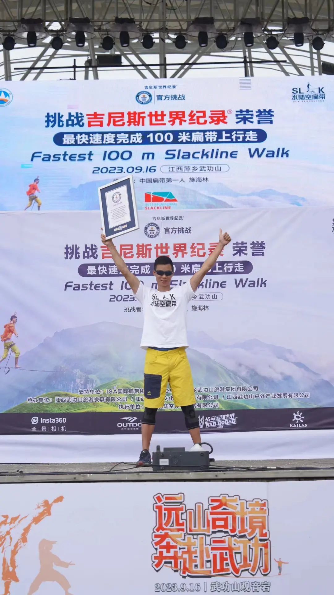 作为本次吉尼斯世界纪录的挑战者,32岁的施海林从2016年开始迷上“高空走扁带”这项极限运动,曾多次刷新亚洲高空扁带长度记录,获得多届全国高空扁带大赛冠军,ISA(国际扁带协会)高空扁带赛事积分榜,世界排名第二。