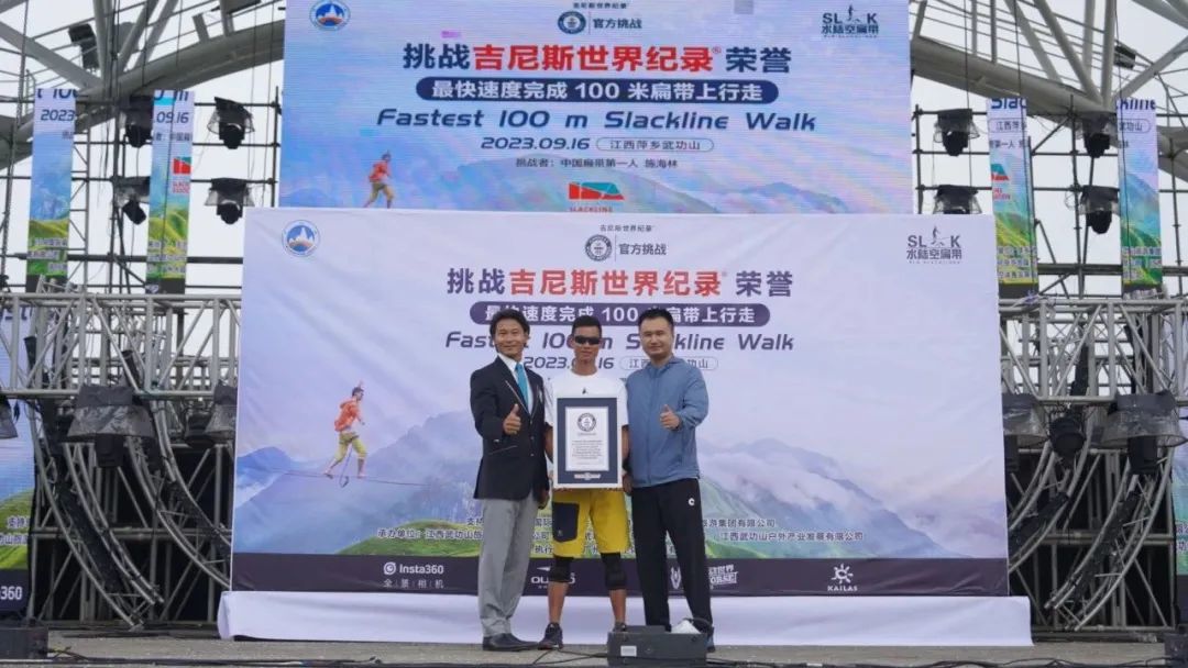 下午2时许,吉尼斯认证挑战活动正式开始。本次挑战,扁带架设在海拔1600米处萍乡武功山云顶景区观音宕营地上,距离地面约100米高,全长240余米,选取其中100米为挑战赛道。施海林仅有一次机会,他在不停地完成各种技巧动作的同时,创下了1分14秒19的吉尼斯世界纪录。