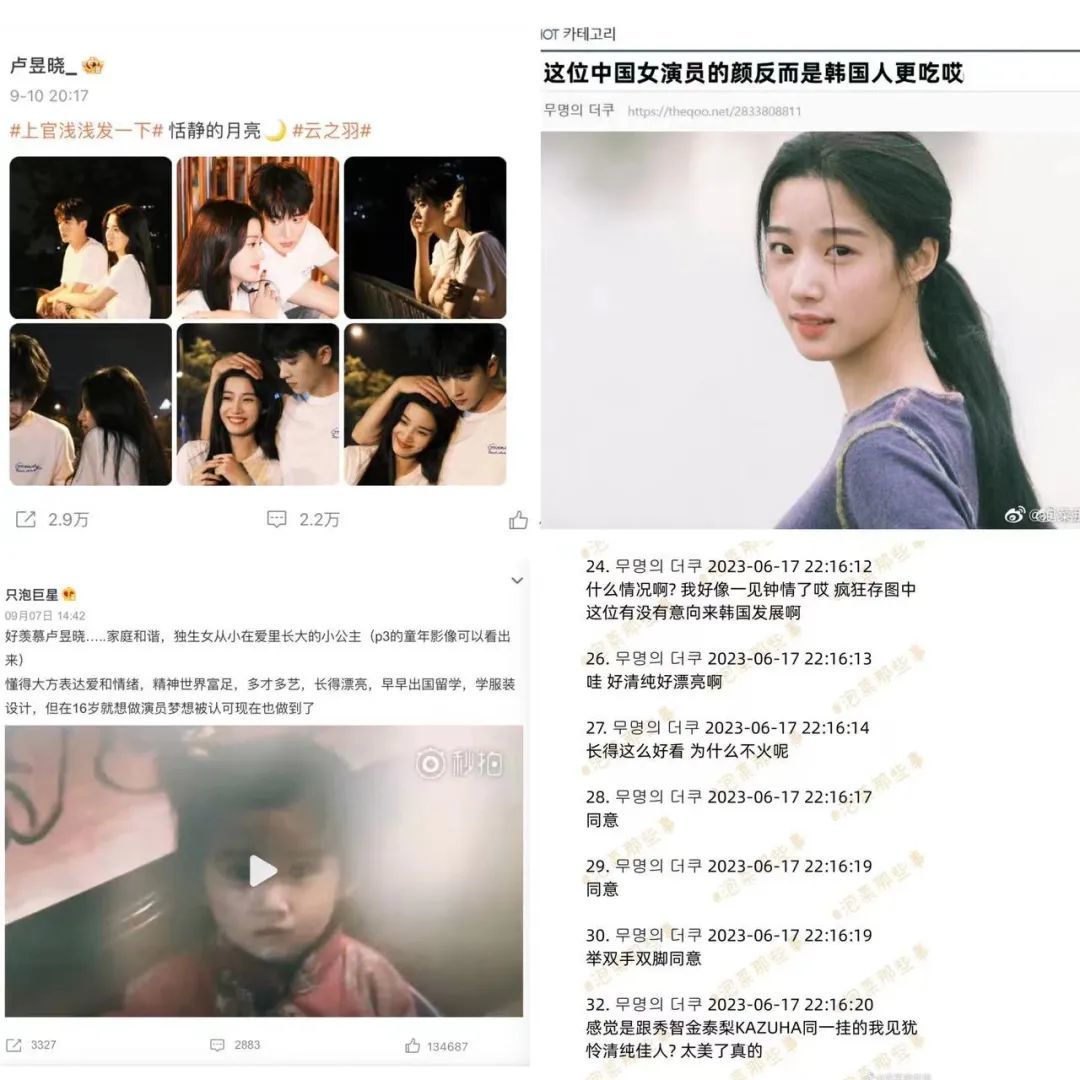 卢昱晓除了炒cp营业比男女主都勤快,还火速跟进了戏外的反差人设——营销家世背景良好,比如“爱里长大的小公主”,与虞书欣最初的营销路数一样,突出富二代公主人设。颜值营销则懂得避重就轻,不谈论“剧抛脸”和妆造问题,而是一个劲围绕韩圈气质做文章,比如热门词条有“内娱有自己的智秀”、“韩网800热楼评卢昱晓”。