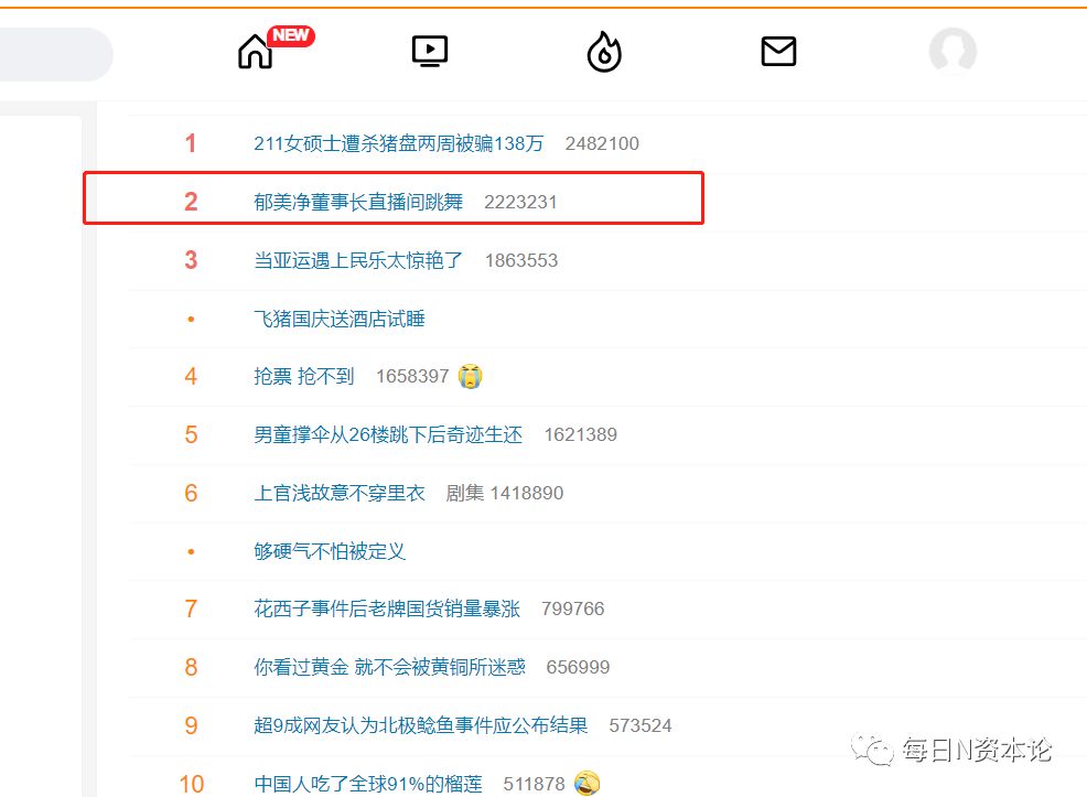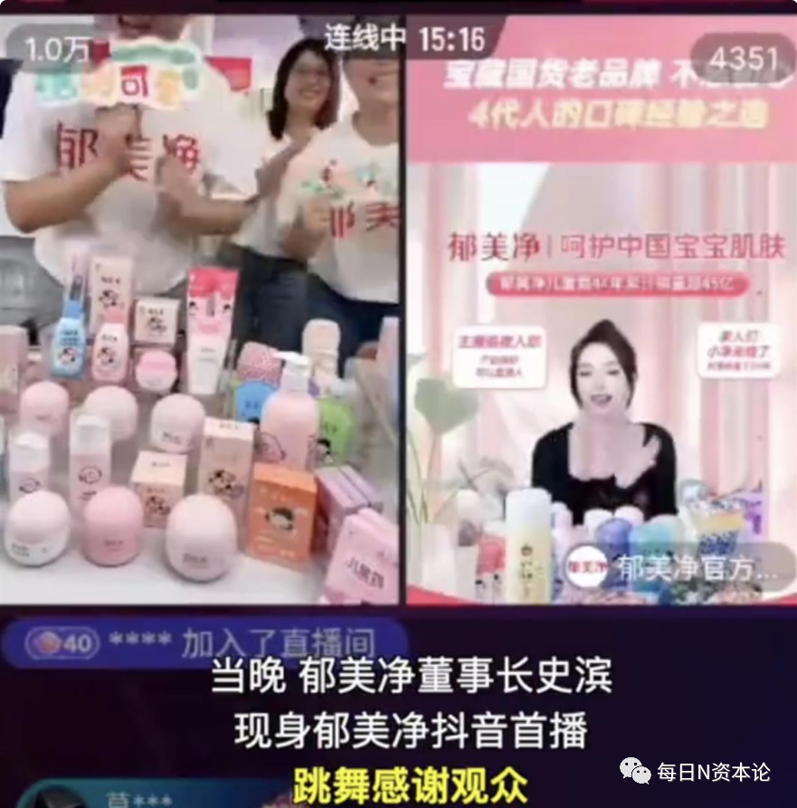 9月15日,“郁美净董事长直播间跳舞”的新闻迅速冲上了微博热搜的第二名。就在前一天,郁美净官宣全面入驻各大平台“终于通网”。当晚,郁美净董事长史滨现身郁美净首次直播,跳舞感谢观众。截至9月14日24时,郁美净粉丝已涨至67万。据蝉妈妈数据显示,直播10小时后,销售额为100万元至250万元。