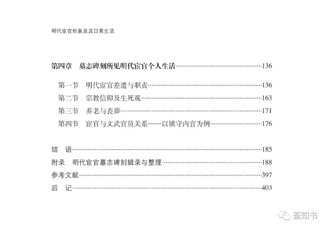 本书以收集到的219通明代宦官墓志碑刻为基本史料,结合《明实录》《明史》等史料对明代宦官生平进行研究。利用画像、雕塑等资料分析明代宦官相貌、衣着等外在形象及其处世风格给人留下的印象,进而分析明代宦官的籍贯分布、入宫方式、明代宦官的培养,最后聚焦于宦官个人生活,包括其职责与升迁、宗教信仰、养老丧葬及人际关系的处理,比较完整展示宦官从入宫到去世的历程,以此显示墓志碑刻对研究人物生平无可取代的重要价值。同时,注意到墓志碑刻记载人物事迹的局限性。