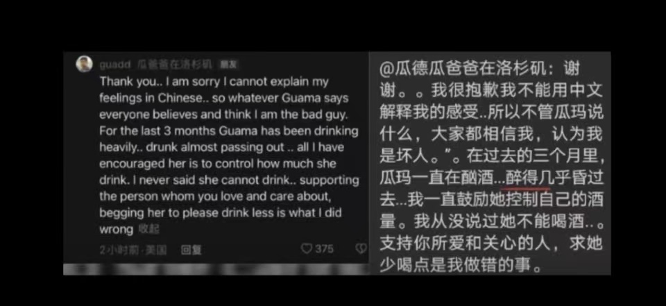 瓜妈官宣离婚时称是由于忍受不了丈夫前妻的频繁骚扰以及继女的怨恨而导致离婚,她在以往的视频和直播中也经常提及丈夫与前妻纠缠不清,影响自己的生活。之后其丈夫瓜爸在国外平台发文解释,是因为瓜妈酗酒成瘾,自己只要一劝导就会引发争吵,并且瓜妈对家庭不管不顾,所以才选择离婚。