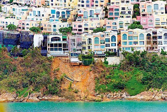 港岛大潭豪宅“红山半岛”第70、72及74号独立屋不敌世纪暴雨,临海方向斜坡发生山泥倾泻,暴露地下建筑地基悬空,部分花园、平台、栏杆及疑为泳池坍塌,屋宇署经视察后认为72号屋有明显危险,随即要求警方疏散占用人,豪宅顿成危楼。