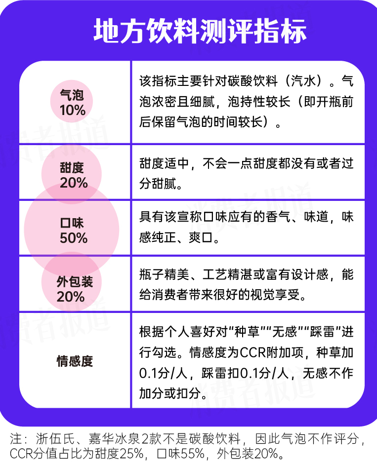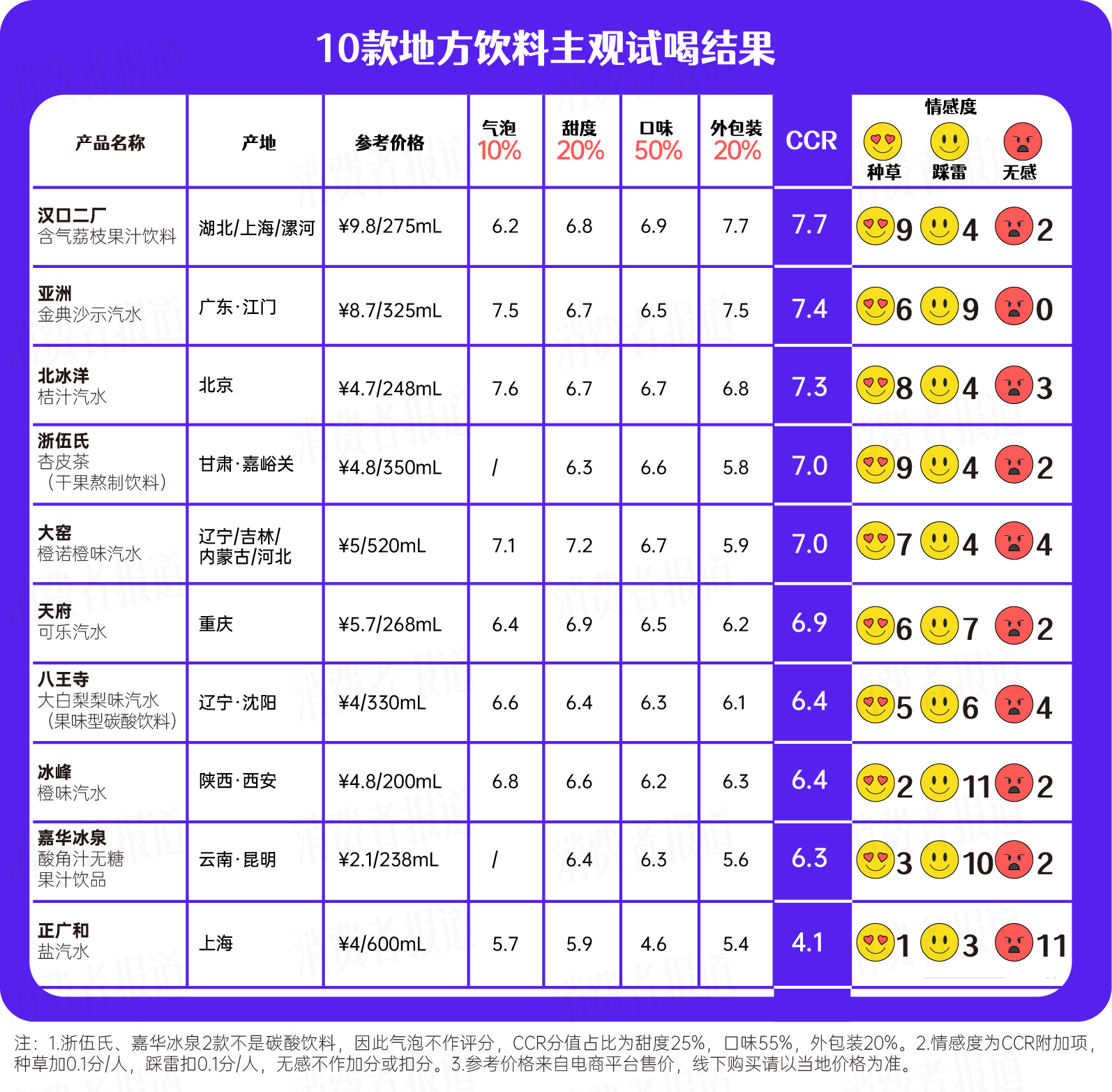 2023年9月,《消费者报道》测评了10款区域饮料,包括汉口二厂、亚洲、北冰洋、浙伍氏、大窑、天府、八王寺、冰峰、嘉华冰泉、正广和。