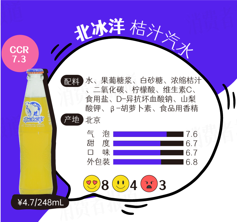 北极贝贝:北冰洋的气泡非常足,桔味浓郁,怀旧的味道,并非甜味占主导,酸甜适口。