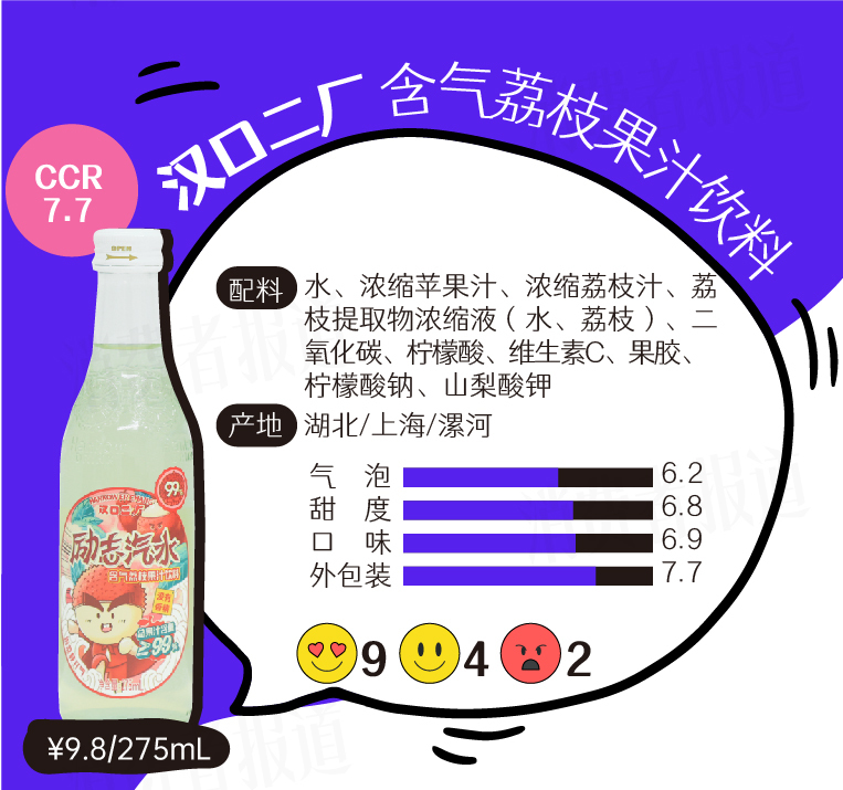 小8:荔枝味很浓,口感清爽,甜度偏甜,不过和口味融合很好,气泡略少。