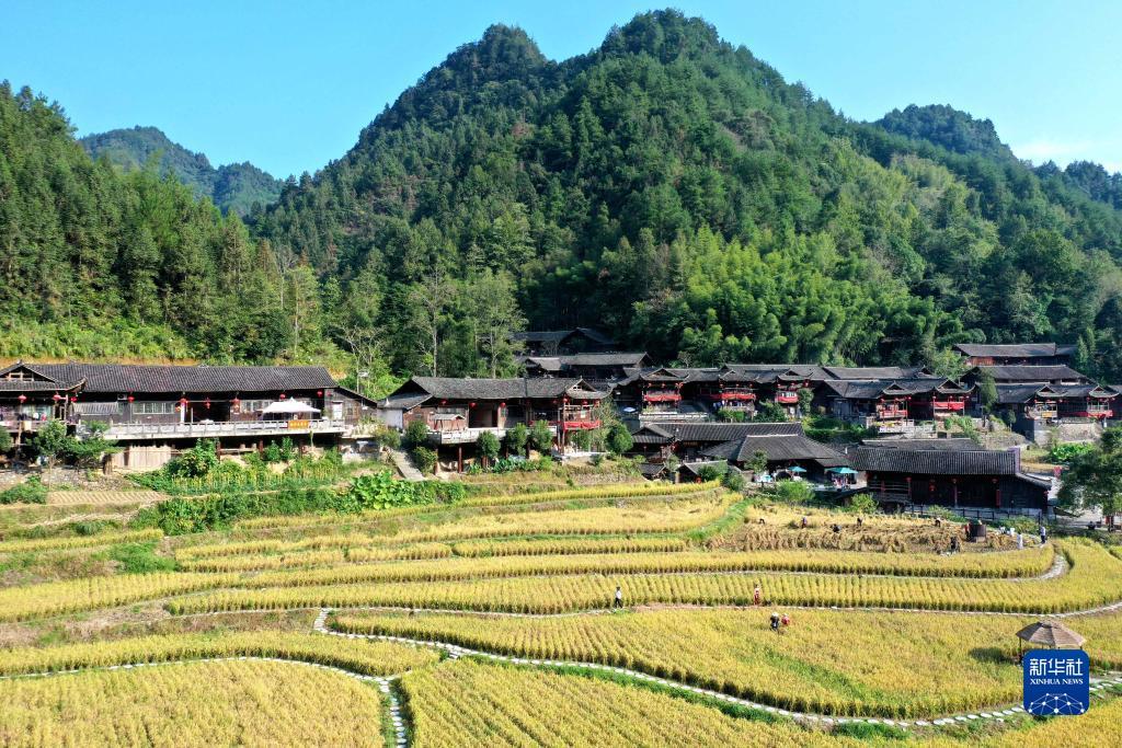 金秋时节,湖北省恩施土家族苗族自治州宣恩县彭家寨古吊脚楼群景色如画。吊脚楼群四周稻田成熟泛黄,楼上居民悬挂玉米点缀其间,古寨丰收图景吸引游客前往感受金秋收获的喜悦。彭家寨是鄂西山区保存完好的土家族民居群落,寨内吊脚楼建筑精美,古色古香。