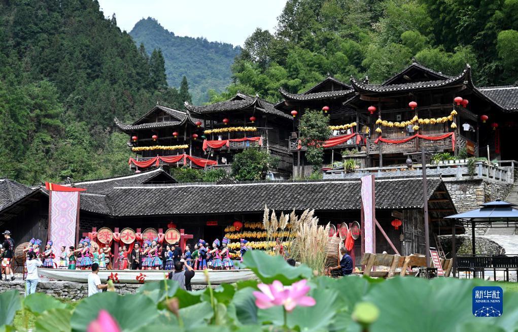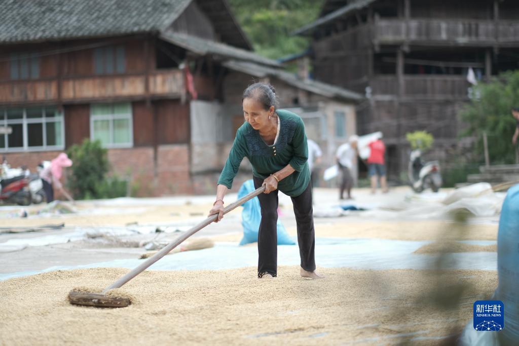 9月18日,在湖南省怀化市通道县坪坦乡下盘古侗寨,村民在鼓楼边晾晒稻谷。