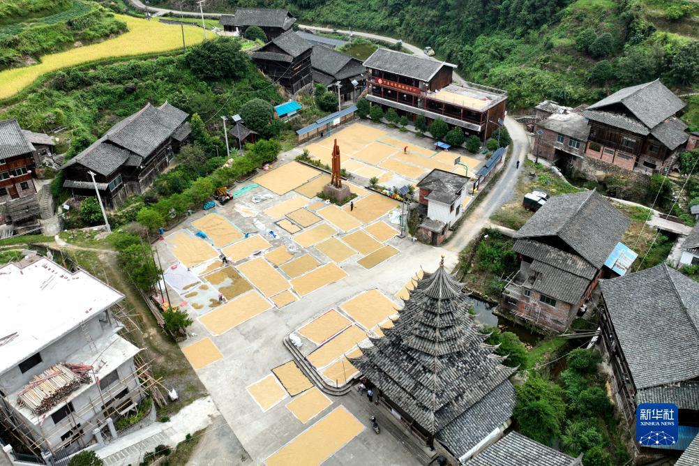 9月18日,在湖南省怀化市通道县坪坦乡下盘古侗寨,村民在鼓楼边晾晒稻谷(无人机照片)。