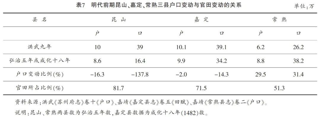 表7中,官田比例最高的昆山,其户口数减少得最多。官田与民田比例相当的常熟,其户口数不减反增。昆山的派役单位减少到如此程度,其实对其官田高比例的一个补偿。