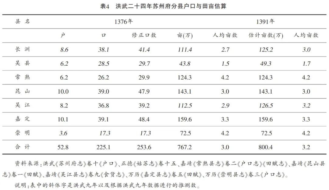 人均亩数最低的三县,吴县、长洲与吴江,采用的都是洪武九年的田亩数。这似乎暗示着,洪武二十四年,这三县的田亩应当更高一些。从洪武九年至洪武二十四年,常熟、昆山、嘉定等三县田亩数从384.5万亩增加至432.3万亩,增加了12.4%。假定长洲、吴县与吴江等三县的增长幅度也是如此,就有估计亩数详见表4。