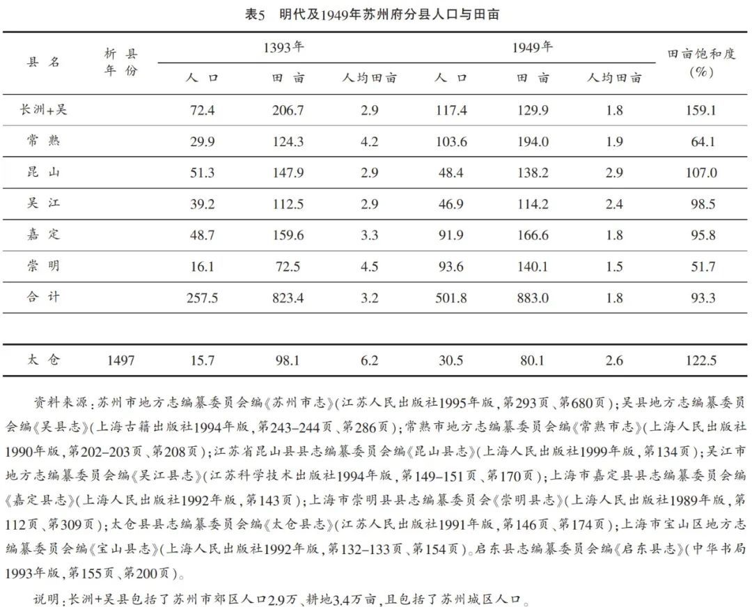 1393年昆山耕地数量略超过1949年,嘉定略少于1949年。1393年崇明田亩饱和度只有51.7%。而据正德《姑苏志》卷十五,弘治十六年崇明田亩多达89.5万亩,田亩饱和度增加至63.9%(89.5/140.1)。