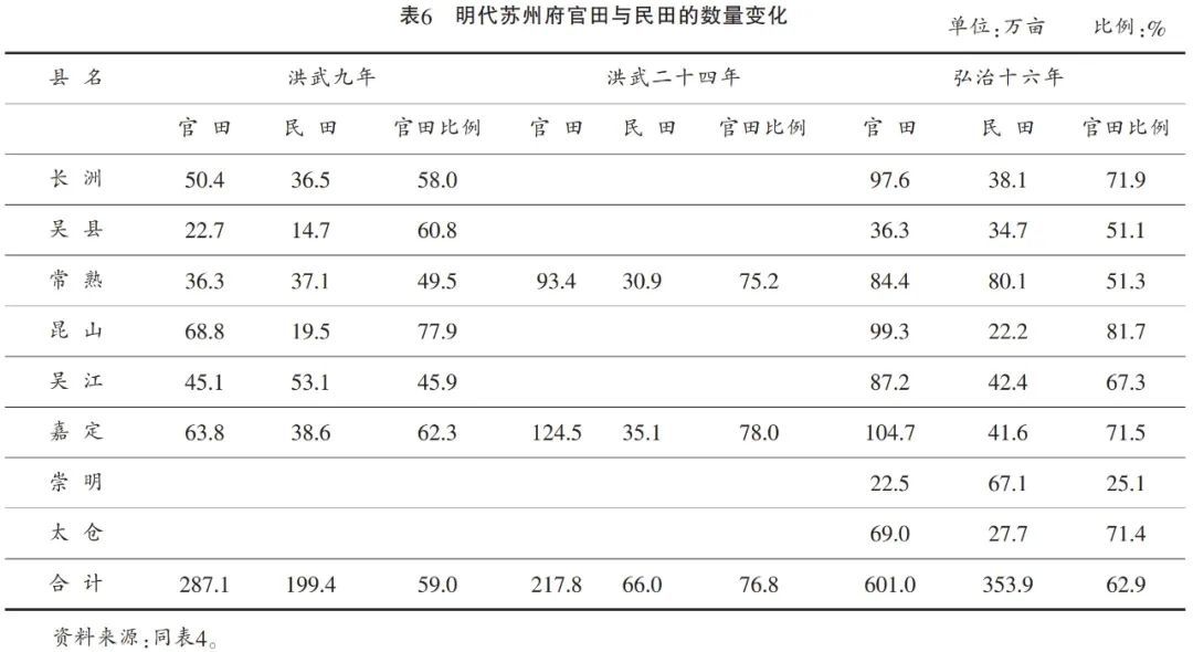 洪武九年六县官田比例只有59%,而昆山高达77.9%。洪武二十四年只有常熟、嘉定两县数据,官田比例高达76.8%,与洪武九年的昆山相近。弘治十六年昆山、长洲、嘉定、太仓四县官田比例最高,在71.4%~81.7%之间。八县官田占全部田亩的62.9%。