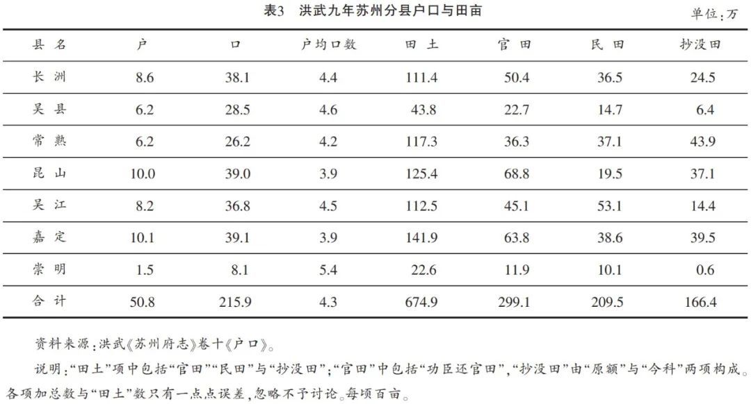 洪武《苏州府志》卷十《户口》记载洪武九年苏州府七县户数50.8万,口数215.9万,户均4.3口。田土674.9万亩,其中包括官田、民田及抄没田若干。具体如表3所示。