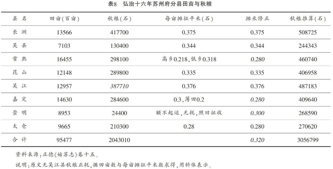 根据田亩数与税则推算出来的分县税粮较原分县税粮皆多,崇明多得最为离谱,原来只有24400石的秋粮,居然推算成了268590石。推算所得分县秋粮加总数为3056799石,大大超过了原记载中分县加总的2043010石。有意思的是,该志在记载分县秋粮之前,其实还有一总额之记载,其数为秋粮正米2038640石,连耗共米3056014石,即原数中的“正米连耗”与表8中的推算几乎完全相同。可见表8对于常熟、嘉定、崇明三县的每亩摊平插值相当准确。