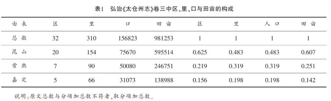 这一算法可以得到检验。弘治《太仓州志》卷三记载了区、里、户、口与田亩的构成,详见表1。