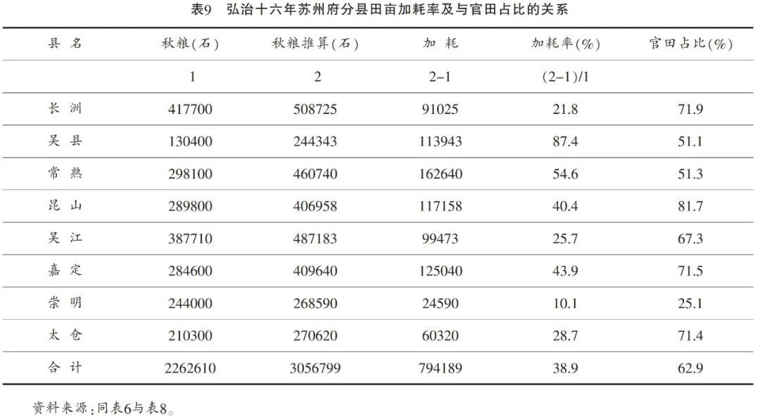 用表9中的“推算秋粮”减去“秋粮”,所得即为“加耗”。用“加耗”除以“秋粮”,所得即为“加耗率”。弘治十六年,苏州府属八县加耗率为38.9%,即100石正粮,征收38.9石“加耗”。