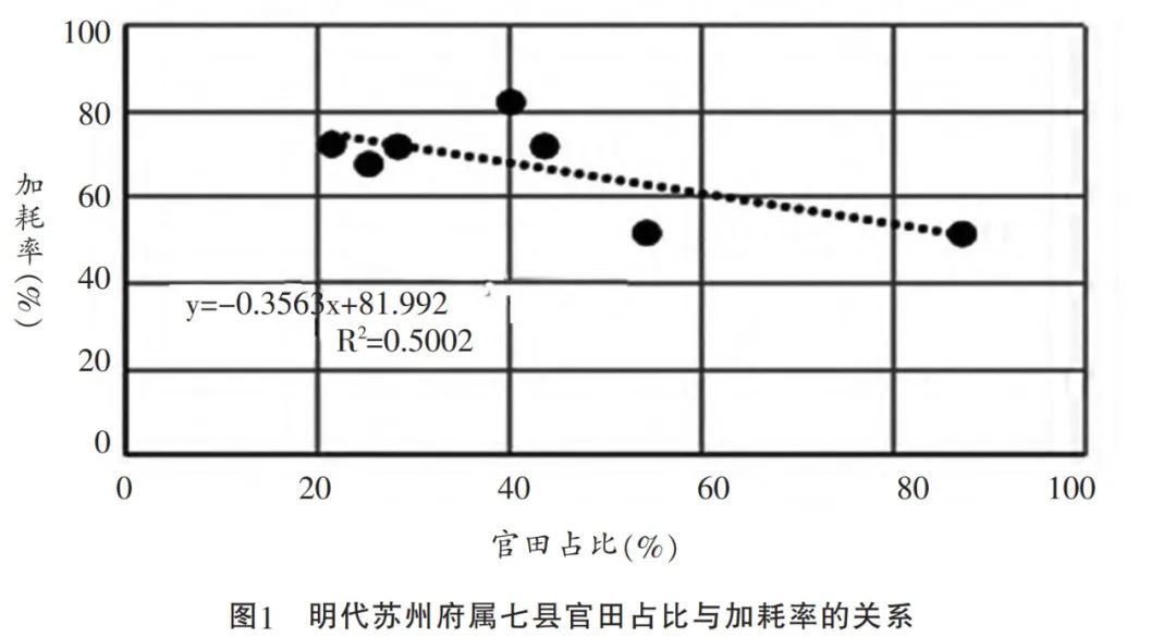 崇明岛孤悬大江之中,官田甚少,排除不计,其余七县的官田占比与加耗率之间存在某种相关性,即官田占比越大,加耗率越低,反之则越高。详见图1。吴县加耗率高达87.4%,稍有一些不正常,令人揣测其中有相当部分的加耗,并不出自田亩,而是出自商业。关于这一点,希望将来能够得到证实或证伪。