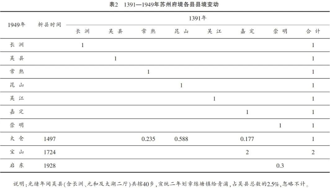 清雍正二年(1724)从长洲县析出元和县。又升太仓州为直隶州,同时析太仓地置镇洋县,析嘉定县置宝山县。太仓州辖镇洋、嘉定、宝山、崇明四县。雍正四年又析吴江偏西之地置震泽县,析常熟东境置昭文县,宣统三年(1911)至民国元年,元和、震泽、昭文、镇洋等四县先后并入各自母县。所以,这些县及类似行政单位的境域变动可以忽略。民国年间,宝山县之南境划入上海市区。1949—1950年间,嘉定与青浦有政区交换,各有划入与划出。当然,嘉定也有部分境域划入上海市区,因面积不大,皆不予讨论。