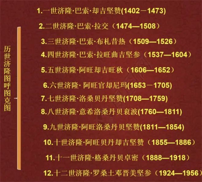 济隆呼图克图,也称巴索活佛、达察活佛、达察呼图克图、达察济隆呼图克图、功德林呼图克图、通善呼图克图等,是西藏地区的一个重要的活佛转世系统,为格鲁派中起源最早、变化最复杂的与清代许多政治事件密切相关的活佛转世系统之一。因为一世济隆·巴索·却吉坚赞曾在很长一段时间内住过后藏伦地巴索地方,故得名巴索·却吉坚赞。由于任第六任甘丹赤巴,故其圆寂后得以转世,被称为巴索活佛,并沿用至第四世。以后第四世巴索·拉旺曲吉坚参出任昌都强巴林寺第十二任法台后,其晚年住在洛隆宗康沙村达察伦珠德钦寺悟禅静修而得名“达察”,此后巴索活佛又被称作“达察活佛”。所谓“济隆”也作“济咙”“吉仲”“济仲”“杰仲”等,据说此称为宗喀巴大师所起,是藏语对西藏大贵族子弟出家后的尊称,可以理解为“尊前”“阁下”等。因六世济隆·阿旺官却尼玛(1653—1705)与五世达赖喇嘛有师徒关系而称其为“济隆”,这就是其后历辈达察活佛冠以“济隆”的由来。由于七世济隆·洛桑贝丹坚赞(1708—1759)被清政府封赐为“呼图克图”,此后济隆活佛世系才被冠以“呼图克图”职衔。同时七世济隆曾任雍和宫堪布,奉旨驻京供职,此后正式成为驻京呼图克图。