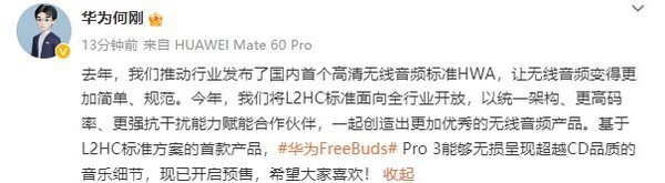 华为终端BG 首席运营官何刚今日发微博称,去年,华为推动行业发布了国内首个高清无线音频标准HWA,让无线音频变得更加简单、规范。今年,华为将L2HC标准面向全行业开放,以统一架构、更高码率、更强抗干扰能力赋能合作伙伴,一起创造出更加优秀的无线音频产品。