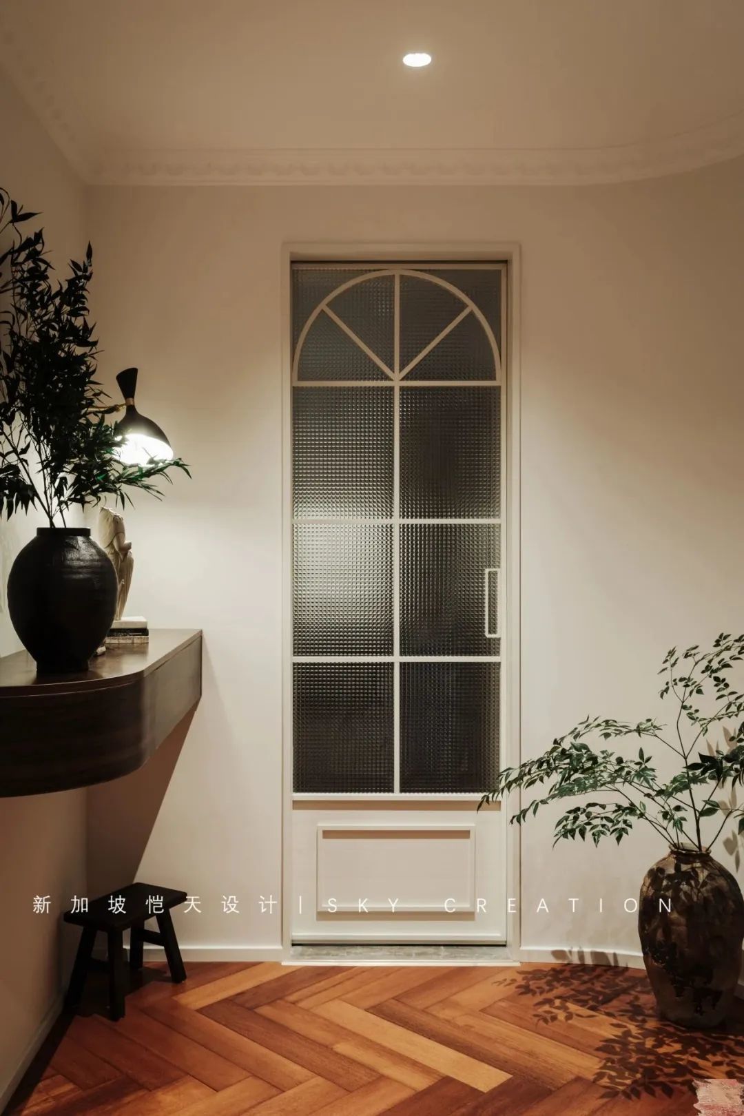 进门右手边,利用弧形墙角柔化空间,并巧用陶瓷花瓶、风干竹叶做点缀,形成禅意、灵动的独特视觉存在。