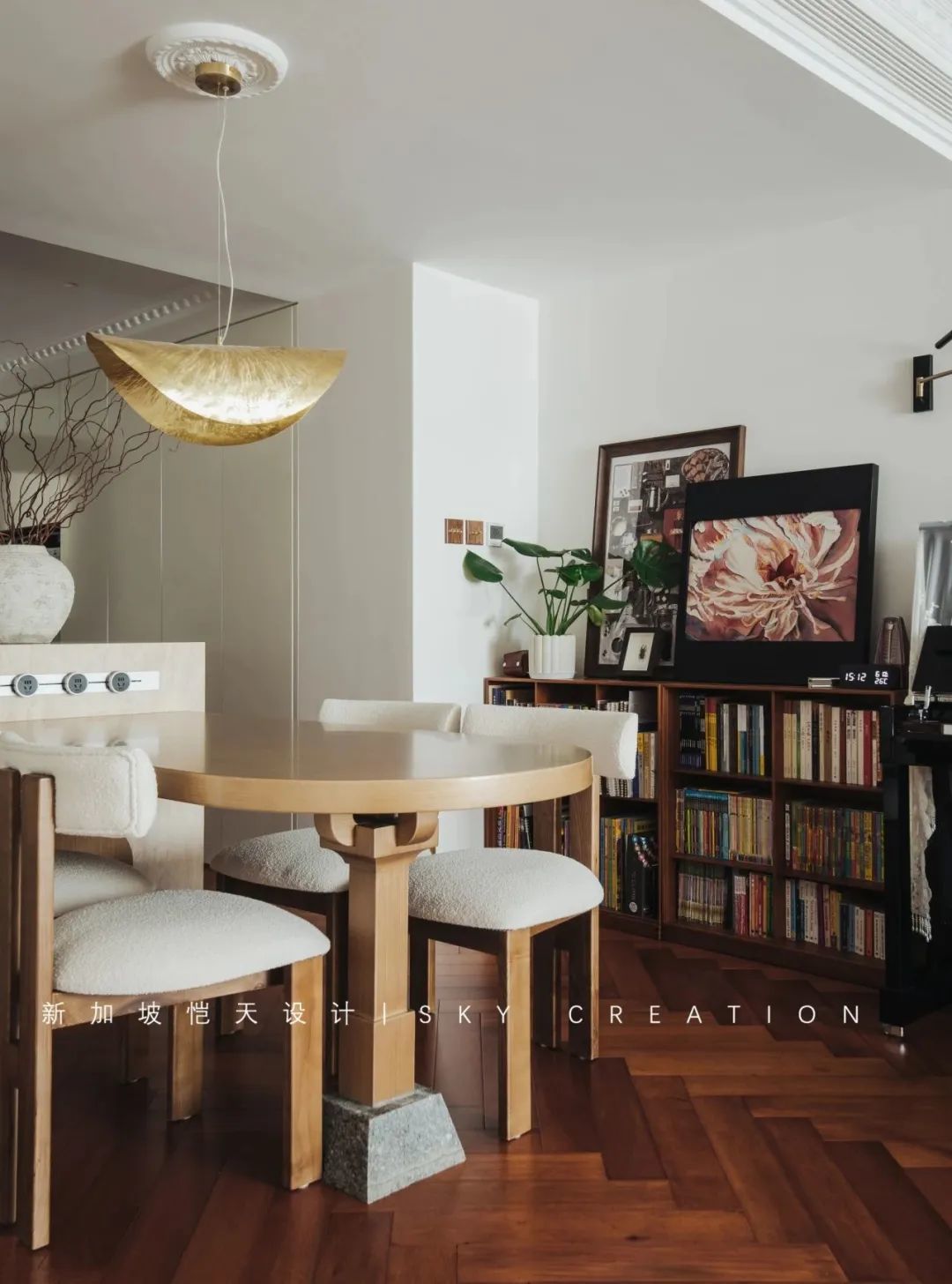 业主家里的书籍较多,餐厅一侧布置了两组成品书柜,上方展示、下方收纳,实用美观、文艺气息满满。