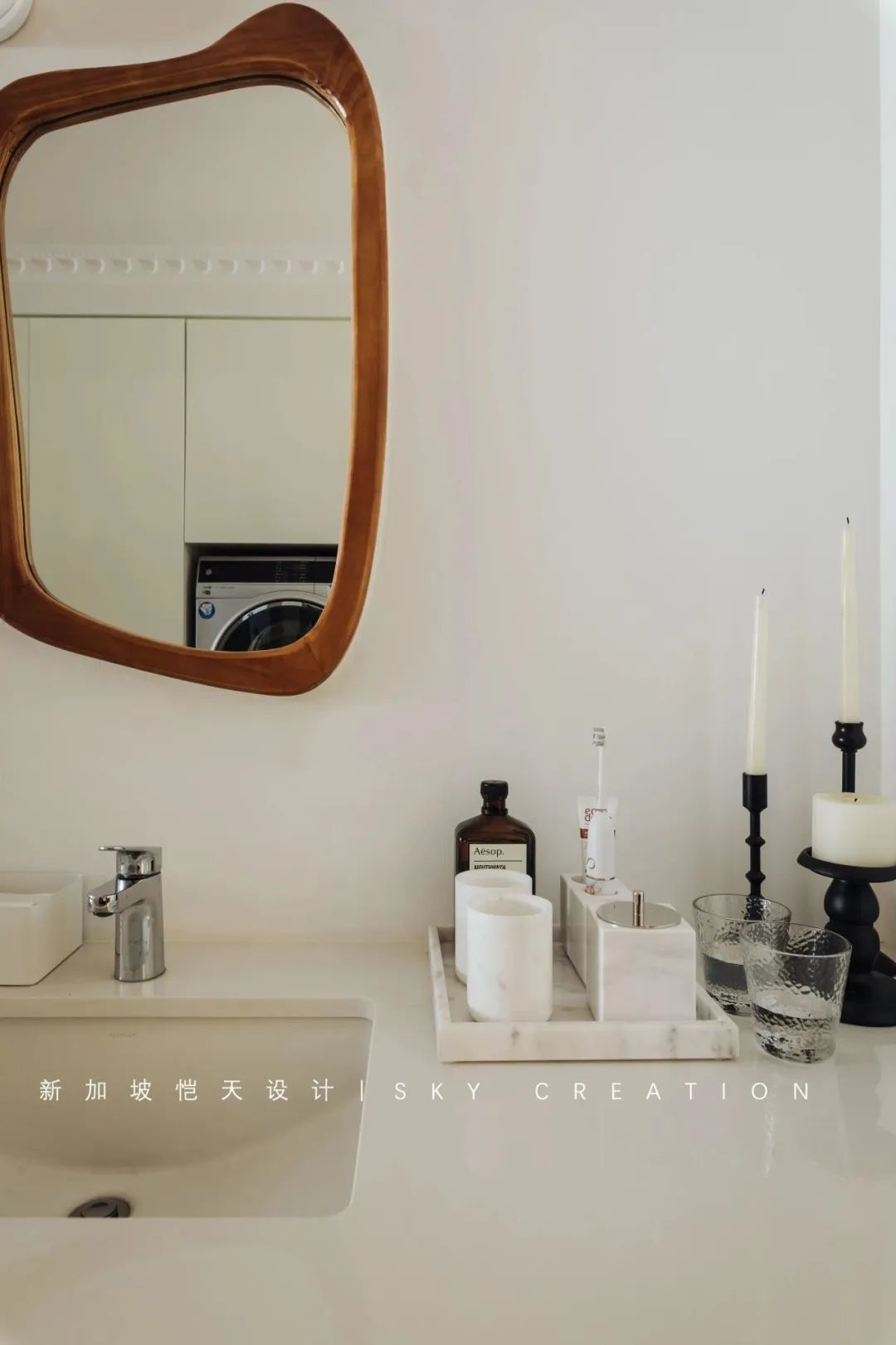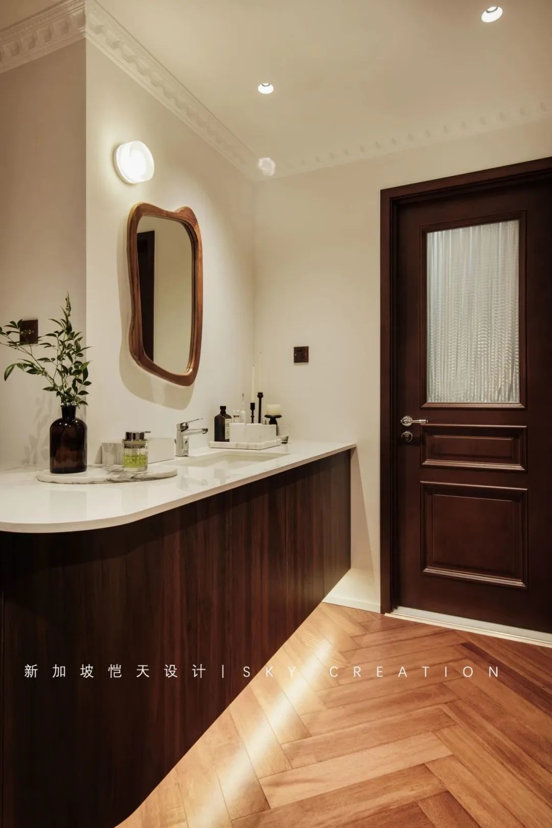 异形洗漱镜呼应整体复古色调,低调简约又不乏时尚个性感。