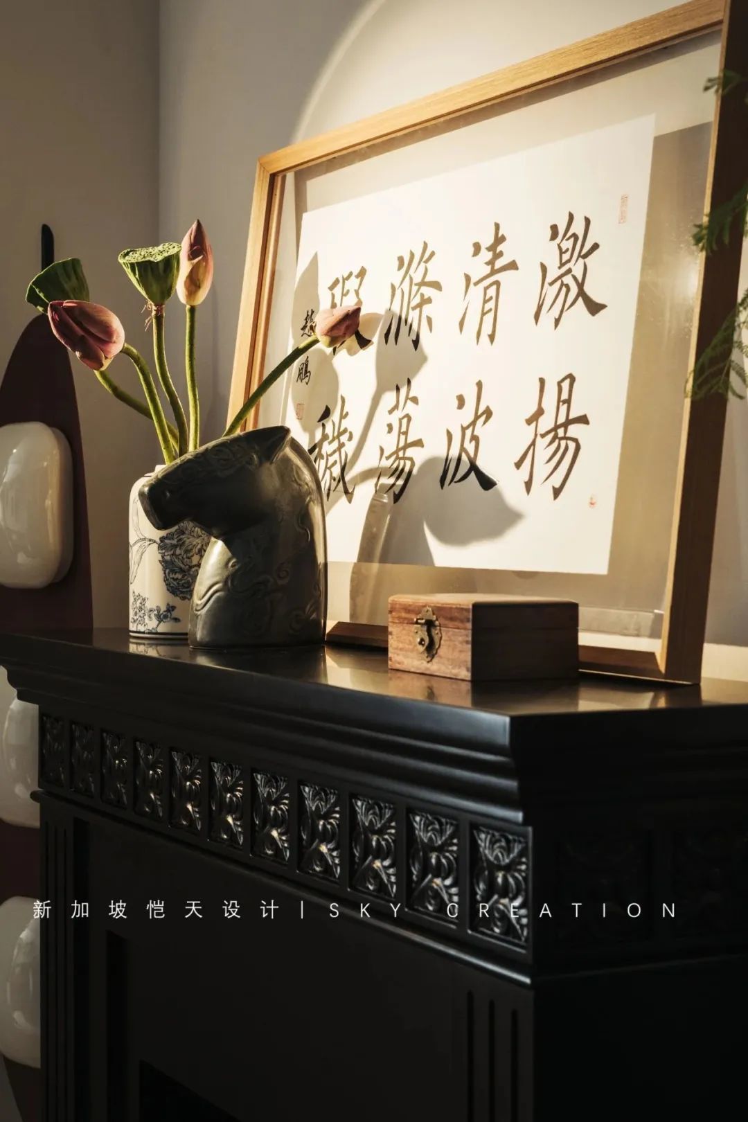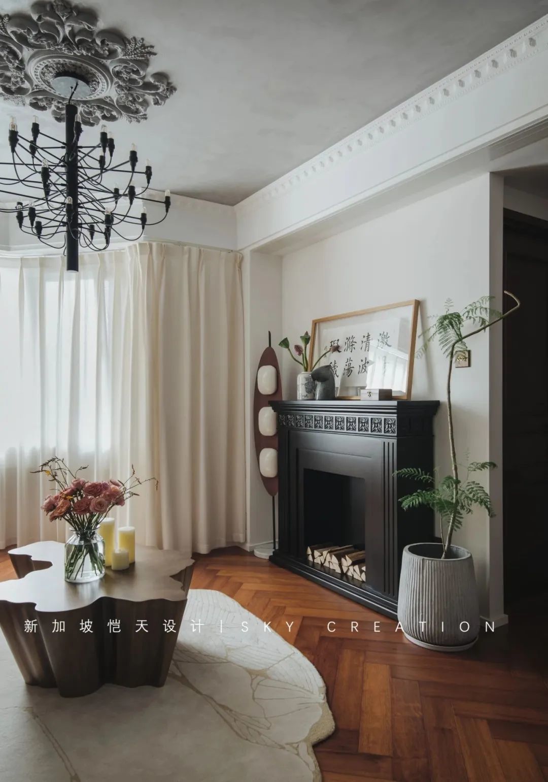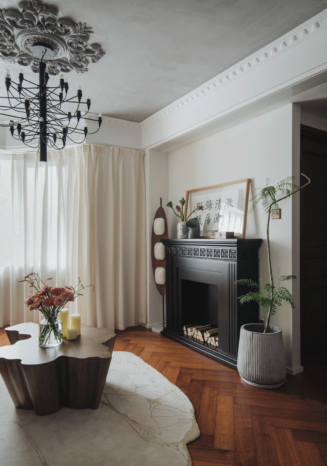 业主很少在家看电视,摒弃传统电视墙,中古豌豆灯、中式花瓶、书法字画与黑色法式壁炉,简直绝配,复古典雅又不失时尚感。