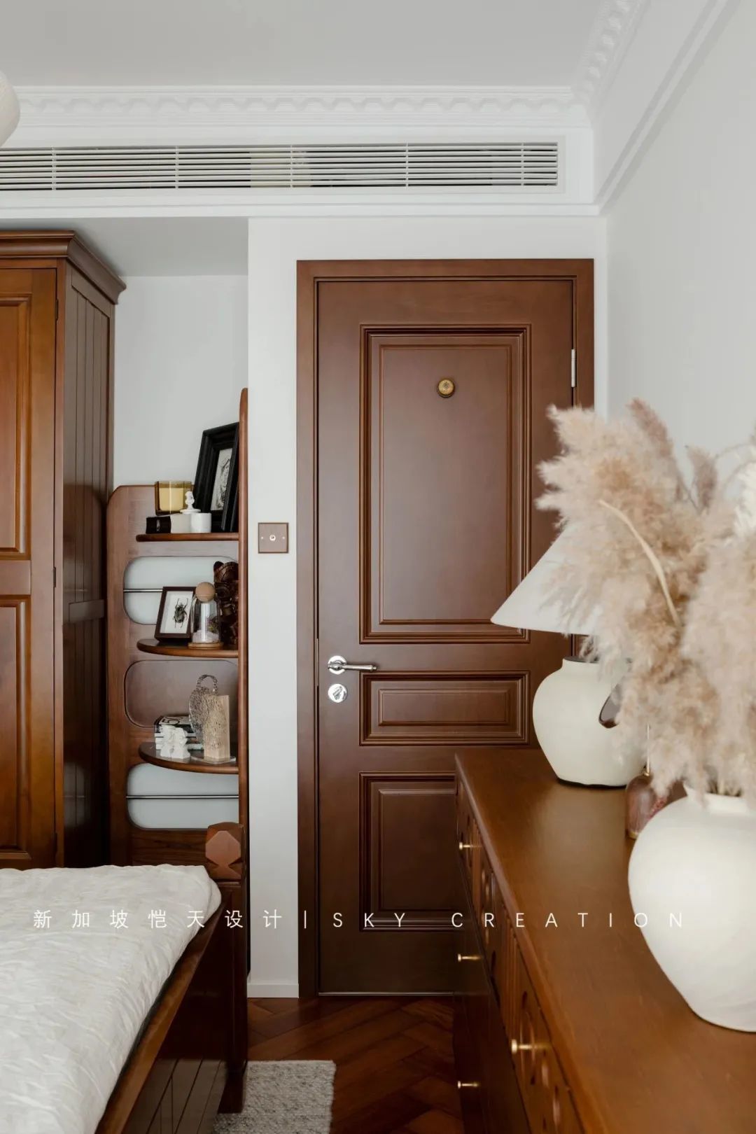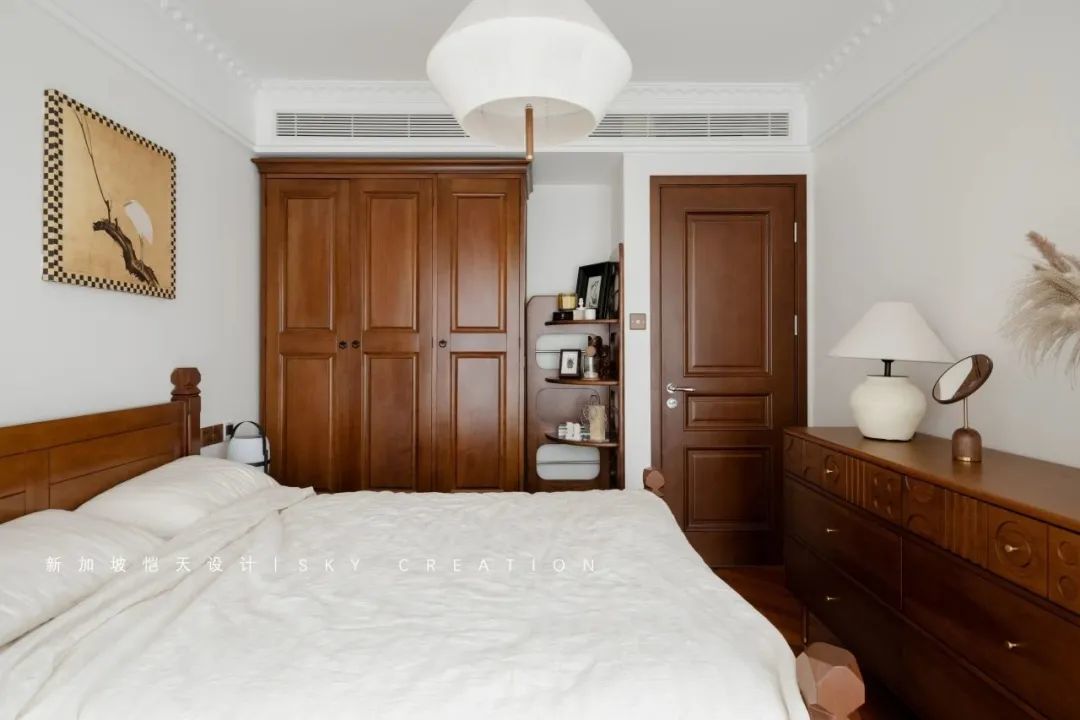 除了业主原衣柜,床尾还设置6抽斗柜,用于放置小件衣物,黄桃木材质色泽浓郁,且富有中古风情,搭配业主自带家具毫无违和感。